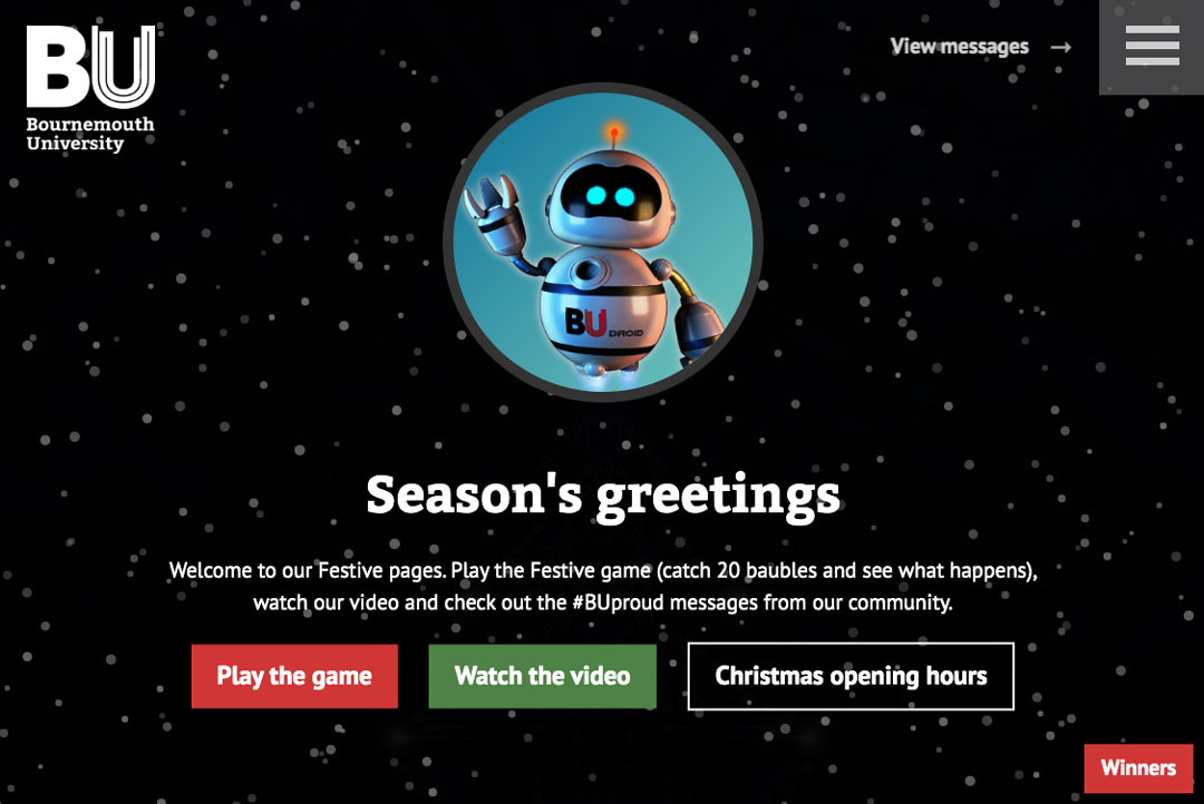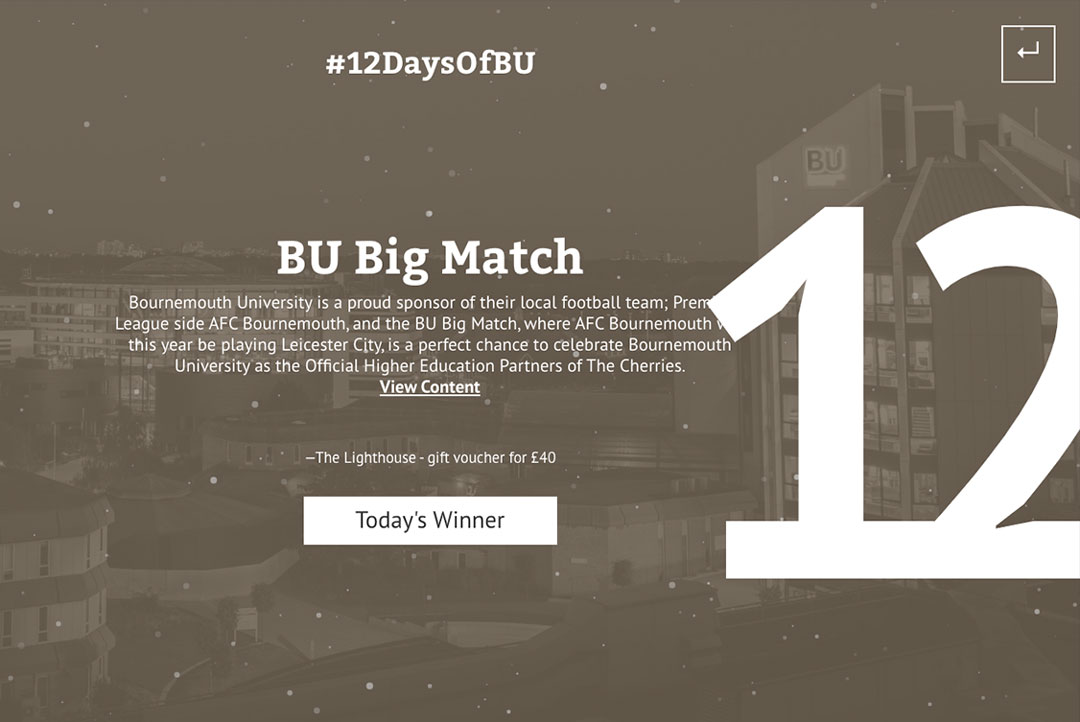 Every year, Bournemouth University closes it's doors for the festive season. With the need to communicate campus closing times, we also take the opportunity to wish the students a nice break and encourage brand engagement. What started as a bit of fun resulted in great things as the campaigns helped see us win at the PRCA awards.