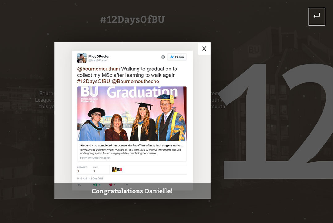 Twenty-five christmas trees were setup around campus with tags and pens available for students to share their university moments and stick them to the tree. Students were also able to engage via Twitter via the hashtag #12DaysOfBU and a winner was selected everyday for 12 days.